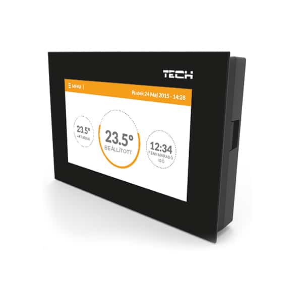 A HU-286 vezeték nélküli színes érintőképernyős szobatermosztát, HU-264 központi egységgel alkalmazva fűtési zónák hőmérsékletének komfortos szabályozására szolgál, exkluzív külső mellett.